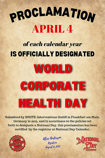 Therefore, it is a matter close to our hearts to call attention not just to the problems of workplace mental health, but also to solutions, with an official, specially dedicated World Corporate Health Day. Each year on the 4th of April it will call corporate health to mind, and spur us all to take measures to promote it.